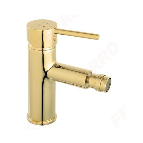 The Ferro Fiesta Bright Gold BFI6G is a deck-mounted single-hole bidet mixer in a luxurious bright gold finish. It features a ceramic cartridge, an automatic metal drain plug G 5/4″, a flow regulator (aerator) size M24 × 1 with a ball-joint, and flexible connection hoses G 3/8 – M10 × 1. Finish: bright gold.