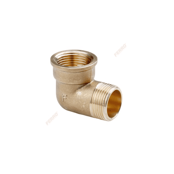 The Ferro 3/4" M–F Brass Elbow is a durable 90° plumbing connector designed to provide a secure transition between male and female threaded connections. Made from high-quality nickel-plated brass, it offers superior corrosion resistance and long-term reliability in hot and cold-water systems, heating installations, and general plumbing applications.