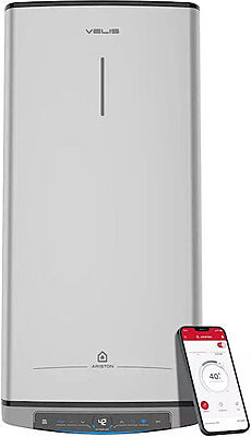 The Velis Tech WiFi is a smart electric water heater (storage / tank type) from Ariston, with WiFi connectivity for remote control via the Ariston NET (or Aqua Ariston NET) app. It is designed with a compact / slim profile to save space: depth is about 27 cm (≈ 275 mm). It supports multi‑position mounting (vertical or horizontal) to adapt to available space constraints.