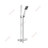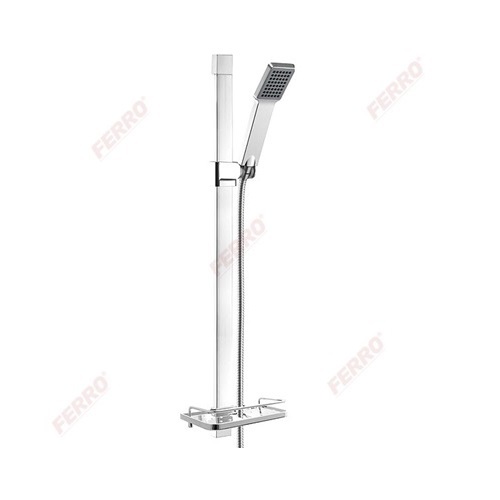 Elegant Ferro QUADRO N110-LA sliding shower set with a modern chrome finish, designed for smooth height adjustment and long-term durability. Includes a contemporary hand shower, adjustable square-profile rail, and flexible hose. Ideal for residential and commercial bathrooms requiring a stylish and reliable shower solution.