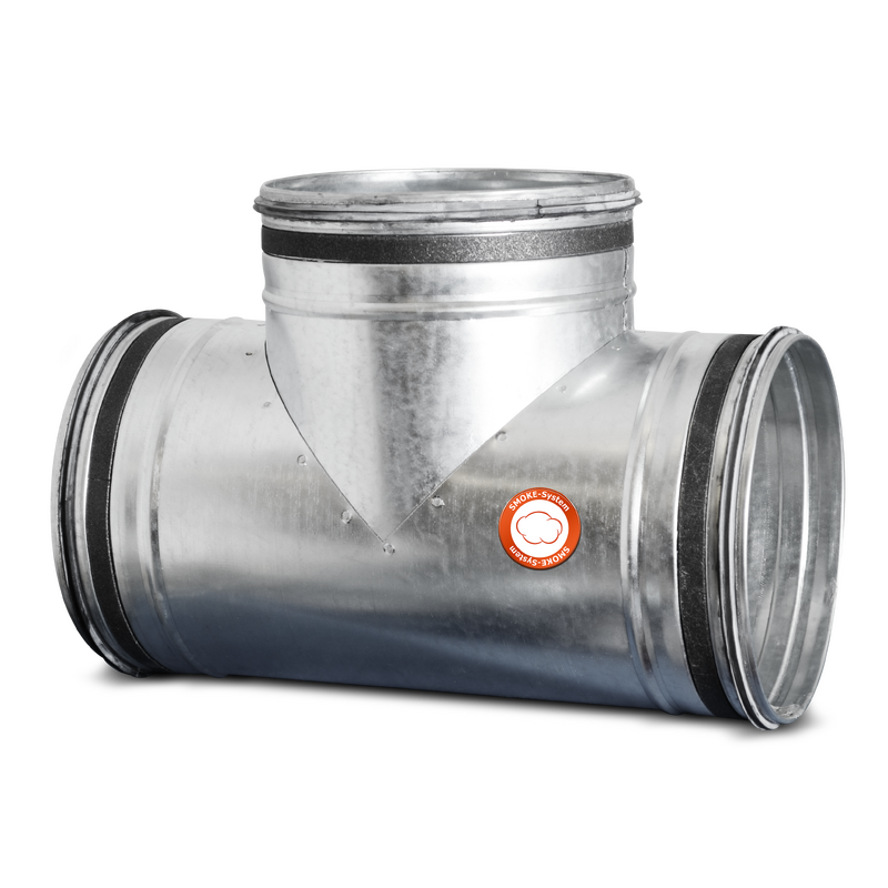 Pressed T-piece, fire resistance class: E600 120 (ho) S1500 single, designed for single-compartment smoke extraction systems and combined (dual-function) systems.Airtightness class D in accordance with PN-EN 12237