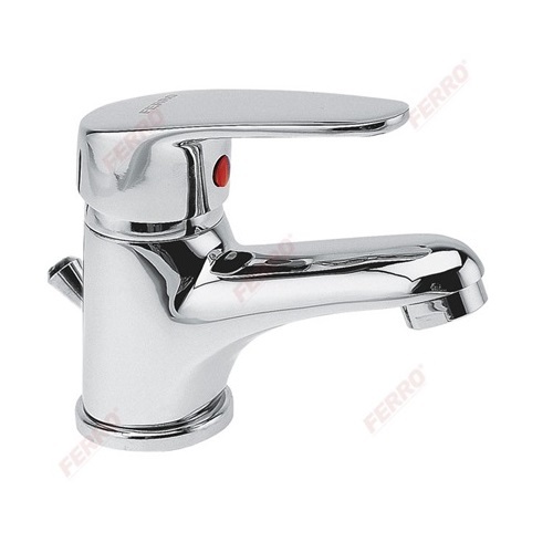 The Ferro Smile BSM2 is a deck-mounted, single-hole standing wash-basin mixer finished in polished chrome. It features a ceramic cartridge, automatic drain plug (G 5/4″), M24 × 1 flow regulator/aerator, and flexible connection hoses G 3/8 – M10 × 1.