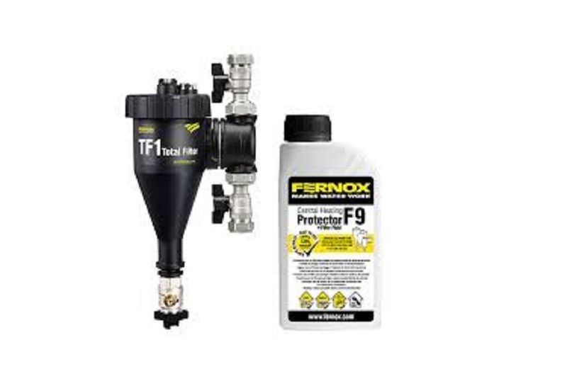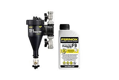 The TF1 Total Filter 1" Pack with F9 is a complete protection kit for hydronic heating systems. It includes the high-efficiency TF1 Total Filter, combining magnetic and hydrocyclonic filtration, along with a bottle of F9 Cleaner/Protector for chemical treatment. This dual-protection solution removes sludge, debris, and corrosion particles while chemically cleaning and conditioning the system, extending equipment life and improving heating performance. Suitable for boilers, heat pumps, and all closed-loop heating installations.