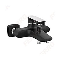 The Ferro Algeo Square BAQ1BLC is a wall-mounted bath mixer in Black/Chrome (Black Concept) finish. Features include a ceramic cartridge, an automatic bath-to-shower switch with lock, an M24 × 1 flow regulator/aerator, G ½″ eccentric inlets spaced at 150 ± 20 mm. The shower set (hand-shower + hose) is not included.