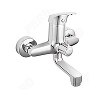 The Ferro One BFO1A is a wall-mounted bath mixer finished in polished chrome. It features a ceramic cartridge, a ceramic bath-shower switch, a swivel spout, a flow regulator of M24×1, G½″ shower connection, and eccentric inlet spacing of 150 ± 20 mm. The shower set is not included.