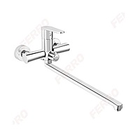 The Ferro Algeo BAQ5A is a wall-mounted mixer designed for use with both a bath and a wash-basin, featuring a built-in shower connection. It includes a ceramic cartridge, a ceramic bath/shower diverter switch, a swivel spout of approx. 352 mm reach, standard G ½″ eccentric inlet spacing of 150 ± 20 mm, and a G ½″ connection for the shower. Finish: polished chrome